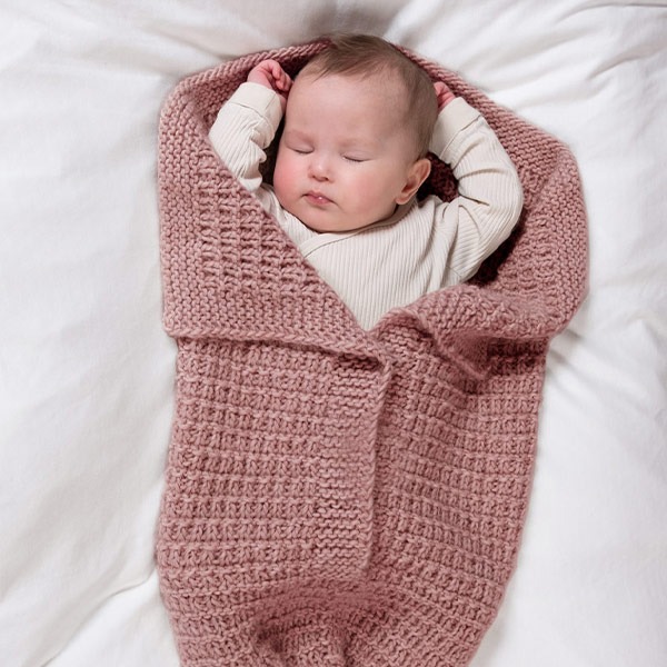 Dette enkle babyteppet i økologisk ull er både teppe og kosepose i ett! Utslått er det et vanlig teppe – brettet og knyttet blir det en lun kosepose. Det er enkelt å strikke – selv for nybegynnere.
